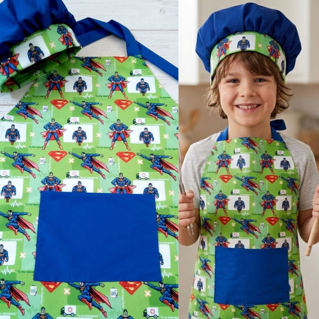 Poder absoluto en la cocina. Este exclusivo set artesanal de Superman combina la resistencia de una prenda hecha a mano con la magia del superhéroe más icónico. Diseñado para pequeños valientes que desean salvar el día entre harinas y recetas, con un estilo único y lleno de fuerza.